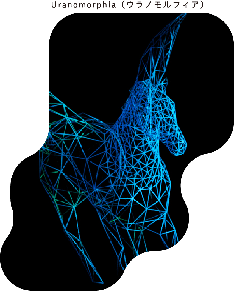 タイトルの「Uranomorphia」は天空や宇宙を意味する古代ギリシャ語の Urano と、形づくるを意味する morphe を組み合わせた造語です。星座の形態や宇宙の構造の可視化を通して、物理世界の制約から解放され、日常的な感覚を超えた視覚世界を描き出します。